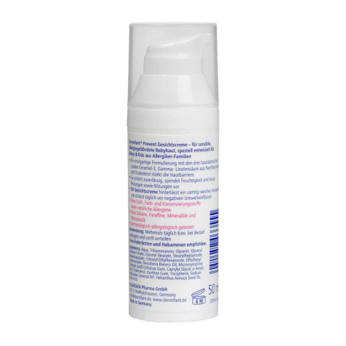 Mehrmals täglich bzw. bei Bedarf auf das Gesicht auftragen und sanft verteilen. Die Dermifant® Prevent Gesichtscreme kann für Babys von Anfang an verwendet werden.