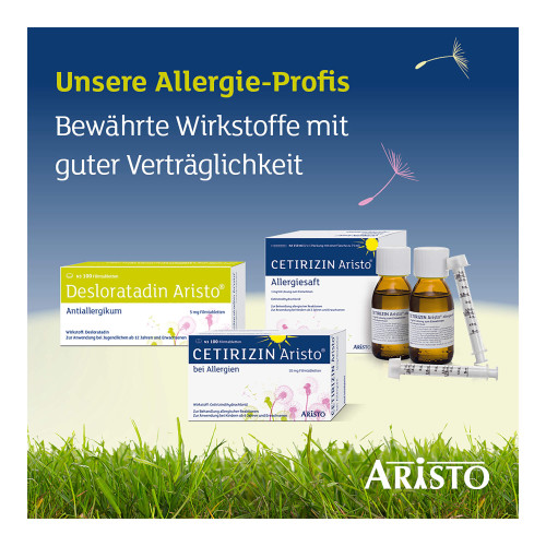 Desloratadin Aristo® 5 mg Filmtabletten. Anwendungsgebiete: Bei Erwachsene und Jugendliche ab 12 Jahren: zur Besserung der Symptomatik bei allergischer Rhinitis (durch eine Allergie hervorgerufene Entzündung der Nasengänge, beispielsweise Heuschnupfen oder Hausstaubmilben-Allergie) und bei Urtikaria (ein durch eine Allergie hervorgerufener Hautzustand mit Symptomen wie Juckreiz und Quaddeln. Warnhinweis: Enthält Lactose.