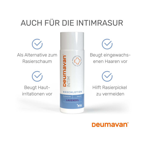 Für die Intimrasur ist die Deumavan Waschlotion auch als Rasierlotion verwendbar, anstelle eines Rasierschaums. Hierfür wird sie nach dem Reinigen – etwas aufgeschäumt – erneut auf den zu rasierenden Bereich aufgetragen. Sie erweicht Härchen und Intimhaut, was die Rasur erleichtert und die Intimhaut schont. Sie hilft Verletzungen, und damit „Rasurbrand“ und Rasurpickel, zu vermeiden. So neigen auch nachwachsende Härchen weniger zum Einwachsen in die Haut.