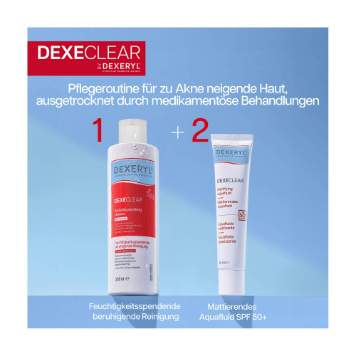 Die DEXECLEAR feuchtigkeitsspendende, beruhigende Reinigung enthält eine 2-in-1-Formel, die speziell für trockene und gereizte Haut entwickelt wurde, die durch eine medikamentöse Akne-Therapie verursacht wird. Es reinigt und hilft, Irritationen und Rötungen zu lindern, während es das Wohlbefinden empfindlicher Haut wiederherstellt.