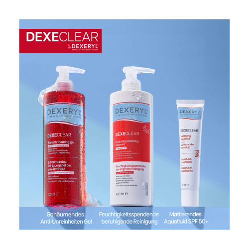 Die DEXECLEAR feuchtigkeitsspendende, beruhigende Reinigung enthält eine 2-in-1-Formel, die speziell für trockene und gereizte Haut entwickelt wurde, die durch eine medikamentöse Akne-Therapie verursacht wird. Es reinigt und hilft, Irritationen und Rötungen zu lindern, während es das Wohlbefinden empfindlicher Haut wiederherstellt.