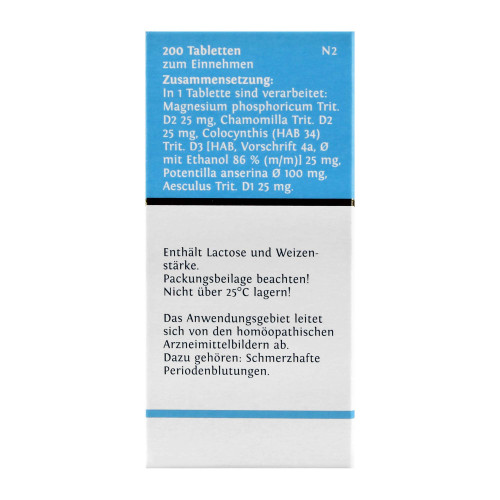 . Anwendungsgebiete: Das Anwendungsgebiet leitet sich von den homöopathischen Arzneimittelbildern ab. Dazu gehören: Schmerzhafte Periodenblutungen. Warnhinweis: Enthält Lactose und Weizenstärke.