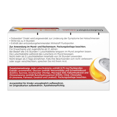 Dobendan® Direkt Flurbiprofen 8,75 mg Lutschtabletten. Wirkstoff: Flurbiprofen. Anwendungsgebiete: Zur kurzzeitigen symptomatischen Behandlung bei schmerzhaften Entzündungen der Rachenschleimhaut bei Erwachsenen und Kindern ab 12 Jahren. Warnhinweise: Enthält Levomenthol, Sucrose, Glucose und Honig.