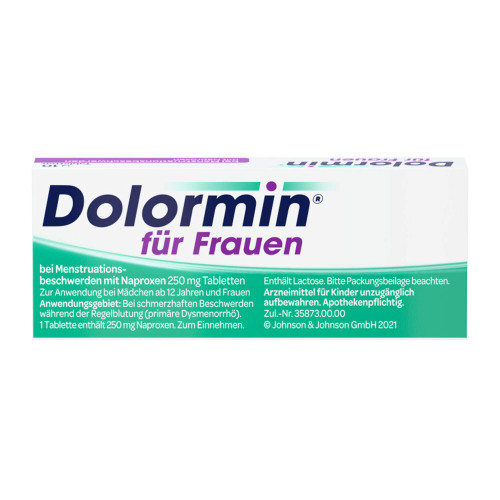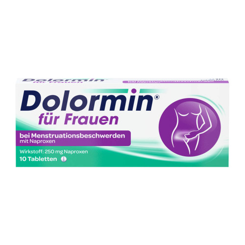 Dolormin für Frauen bei Menstruationsbeschwerden mit Naproxen. Anwendungsgebiete: Schmerzhafte Beschwerden während der Regelblutung. Warnhinweis: Enthält Lactose. Ohne ärztlichen Rat nicht länger anwenden als in der Packungsbeilage vorgegeben!
