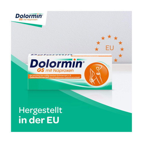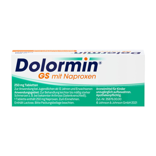 Dolormin GS mit Naproxen. Anwendungsgebiete: Symptomatische Behandlung leichter bis mäßig starker Schmerzen z.B. bei bekannter Arthrose (Gelenkverschleiß). Warnhinweis: Enthält Lactose. Ohne ärztlichen Rat nicht länger anwenden als in der Packungsbeilage vorgegeben!
