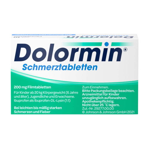 Dolormin Schmerztabletten. Wirkstoff: Ibuprofen als Ibuprofen-DL-Lysin (1:1). Anwendungsgebiete: Leichte bis mäßig starke Schmerzen – wie Kopfschmerzen, Zahnschmerzen, Regelschmerzen; Fieber. Für Kinder ab 20 kg Körpergewicht (6 Jahre und älter), Jugendliche und Erwachsene. Warnhinweis:Bei Schmerzen oder Fieber ohne ärztlichen Rat nicht länger anwenden als in der Packungsbeilage vorgegeben!