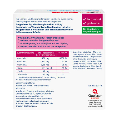 Doppelherz B12 Vita-Energie enthält 450 µg hochdosiertes Vitamin B12 in Kombination mit drei ausgesuchten B-Vitaminen und den Eiweißbausteinen L-Glutamin und L-Serin.