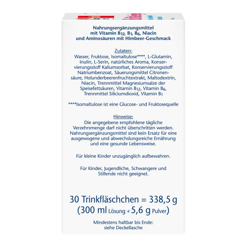 Wasser, Fruktose, Isomaltulose**, L-Glutamin, Inulin, L-Serin, natürliches Aroma, Säuerungsmittel Citronensäure, Konservierungsstoff Kaliumsorbat, Konservierungsstoff Natriumbenzoat, Holunderbeerextrakt, Maltodextrin, Niacin, Trennmittel Magnesiumsalze der Speisefettsäuren, Vitamin B12, Vitamin B6, Trennmittel Siliciumdioxid, Vitamin B1.