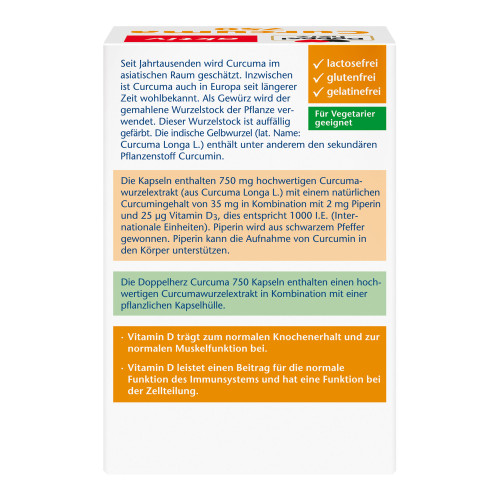 Die Doppelherz Curcuma 750 Kapseln enthalten einen hochwertigen Curcumawurzelextrakt in Kombination mit einer pflanzlichen Kapselhülle.