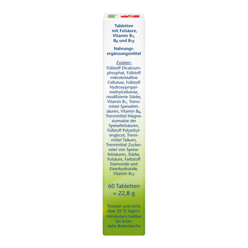 Füllstoff Dicalciumphosphat, Füllstoff mikrokristalline Cellulose, Füllstoff Hydroxypropylmethylcellulose, modifizierte Stärke, Vitamin B1, Trennmittel Speisefettsäuren, Vitamin B6, Trennmittel Magnesiumsalze der Speisefettsäuren, Füllstoff Polyethylenglycol, Trennmittel Talkum, Trennmittel Zuckerester von Speisefettsäuren, Stärke, Folsäure, Farbstoff Eisenoxide und Eisenhydroxide, Vitamin B12.