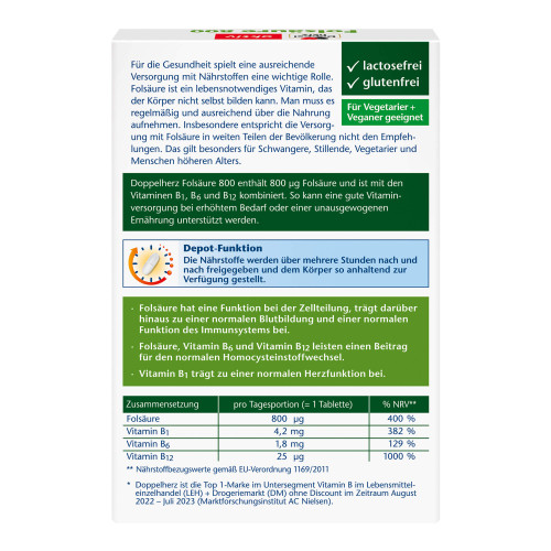 Doppelherz Folsäure 800 enthält 800 µg Folsäure und ist mit den Vitaminen B1, B6 und B12 kombiniert. So kann eine gute Vitaminversorgung bei erhöhtem Bedarf oder einer unausgewogenen Ernährung unterstützt werden.