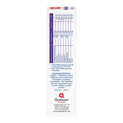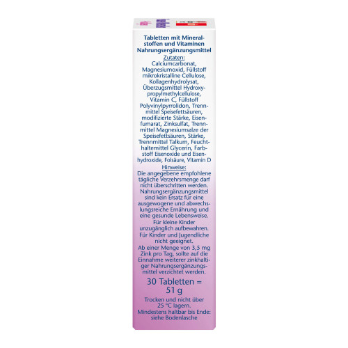 Calciumcarbonat, Magnesiumoxid, Füllstoff mikrokristalline Cellulose, Kollagenhydrolysat, Überzugsmittel Hydroxypropylmethylcellulose, Vitamin C, Füllstoff Polyvinylpyrrolidon, Trennmittel Speisefettsäuren, modifizierte Stärke, Eisenfumarat, Zinksulfat, Trennmittel Magnesiumsalze der Speisefettsäuren, Stärke, Trennmittel Talkum, Feuchthaltemittel Glycerin, Farbstoff Eisenoxide und Eisenhydroxide, Folsäure, Vitamin D.