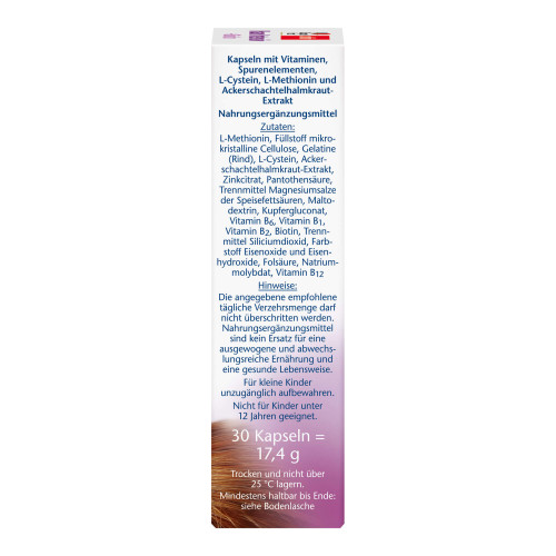 Füllstoff mikrokristalline Cellulose, L-Methionin, Gelatine (Rind), L-Cystein, Schachtelhalmextrakt, Pantothensäure, Zinkcarbonat, Maltodextrin, Trennmittel Magnesiumsalze der Speisefettsäuren, Trennmittel Siliciumdioxid, Vitamin B6, Vitamin B2, Vitamin B1, Farbstoffe Eisenoxide und Eisenhydroxide, Biotin, Kupfercarbonat, Folsäure, Natriummolybdat, Vitamin B12.