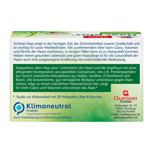 Doppelherz aktiv Haar plus+ unterstützt die Haare und die Kopfhaut mit einer pflegenden Komposition aus speziellen Substanzen, wie z. B. Proteinpeptiden aus Sericin (natürliche Kittsubstanz aus Seide), Lecithin, D-Panthenol und Biotin. Die konzentrierte, gut verträgliche Rezeptur unterstützt gegen Haarverlust, trägt zu einem natürlichen Haarwachstum bei, sorgt für mehr Glanz und Volumen und schützt das Haar.*