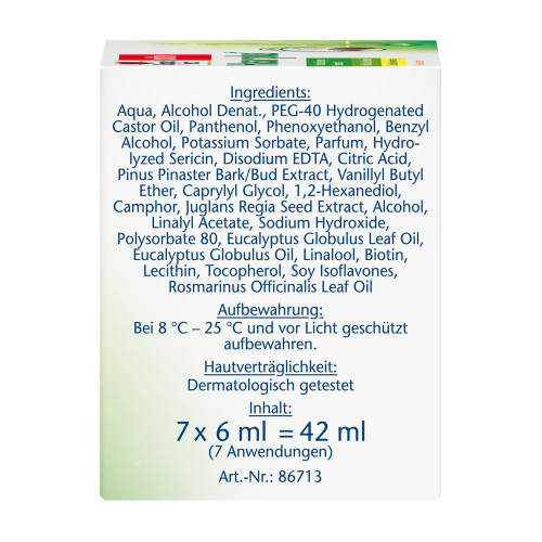 Aqua, Alcohol Denat., PEG-40 Hydrogenated Castor Oil, Panthenol, Phenoxyethanol, Benzyl Alcohol, Potassium Sorbate, Parfum, Hydrolyzed Sericin, Disodium EDTA, Citric Acid, Pinus Pinaster Bark/Bud Extract, Vanillyl Butyl Ether, Caprylyl Glycol, 1,2-Hexanediol, Juglans Regia Seed Extract, Alcohol, Sodium Hydroxide, Polysorbate 80, Eucalyptus Globulus Leaf Oil, Linalool, Biotin, Lecithin, Tocopherol, Soy Isoflavones, Rosmarinus Officinalis Leaf Oil.