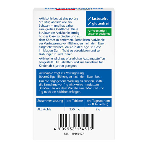 4 Tabletten (entsprechend 1 g Aktivkohle) mindestens 30 Minuten vor einer Mahlzeit und 4 Tabletten nach einer Mahlzeit mit ausreichend Flüssigkeit unzerkaut einnehmen.