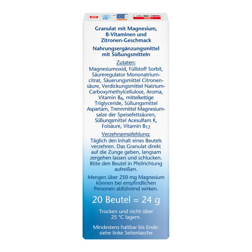 Nahrungsergänzungsmittel mit Magnesium und B-Vitaminen. Granulat mit Zitronen-Geschmack.