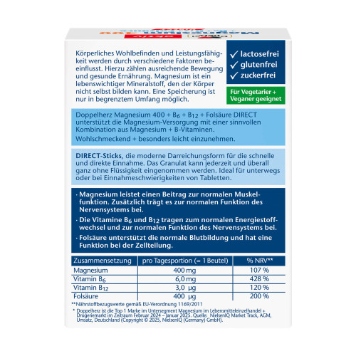 Doppelherz Magnesium 400+B6+B12+Folsäure DIRECT unterstützt die Magnesium-Versorgung mit einer sinnvollen Kombination aus Magnesium + B-Vitaminen.