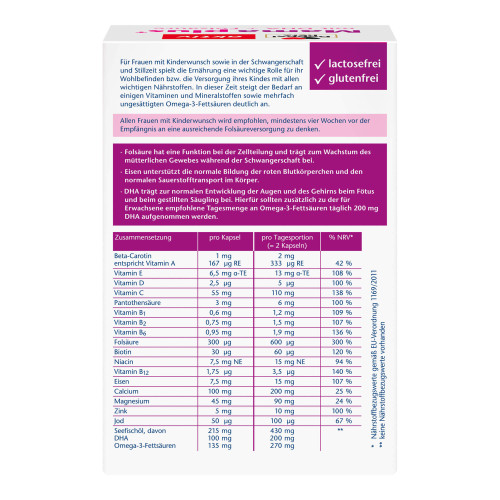 Calciumcarbonat, Seefischöl, Gelatine (Rind), Sojaöl, Kokosöl, Magnesiumoxid, Vitamin C, Feuchthaltemittel Glycerin, Eisenfumarat, Emulgator Mono- und Diglyceride von Speisefettsäuren, Emulgator Lecithine (Soja), Feuchthaltemittel Sorbit, Niacin, Vitamin E, Zinkoxid, Pantothensäure, Farbstoff Eisenoxide und Eisenhydroxide, Vitamin B6, Vitamin A (Beta-Carotin), Vitamin B2, Vitamin B1, Folsäure, Kaliumiodid, Biotin, Vitamin D, Vitamin B12.