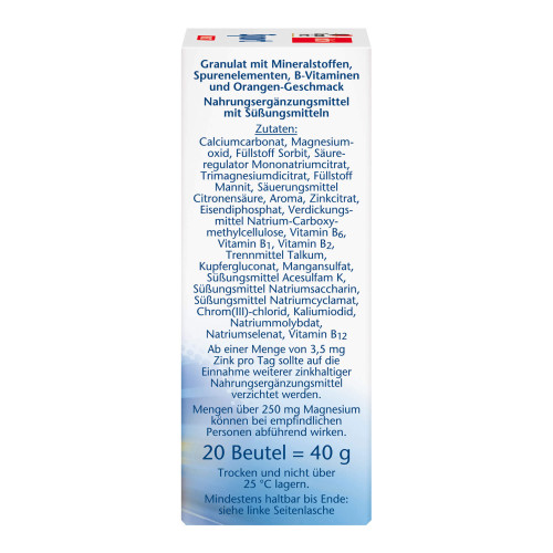 Calciumcarbonat, Magnesiumoxid, Füllstoff Sorbit, Säureregulator Mononatriumcitrat, Trimagnesiumdicitrat, Füllstoff Mannit, Säuerungsmittel Citronensäure, Aroma, Zinkcitrat, Eisendiphosphat, Verdickungsmittel Natrium-Carboxymethylcellulose, Vitamin B6, Vitamin B1, Vitamin B2, Trennmittel Talkum, Kupfergluconat, Mangansulfat, Süßungsmittel Acesulfam K, Süßungsmittel Natriumsaccharin, Süßungsmittel Natriumcyclamat, Chrom(III)-chlorid, Kaliumiodid, Natriummolybdat, Natriumselenat, Vitamin B12.