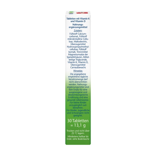 Füllstoff Calciumcarbonat, Füllstoff mikrokristalline Cellulose, Maltodextrin, Überzugsmittel Hydroxypropylmethylcellulose, Füllstoff Isomalt, Trennmittel Magnesiumsalze der Speisefettsäuren, mittelkettige Triglyceride, Menachinon, Cholecalciferol, Überzugsmittel Carnaubawachs.
