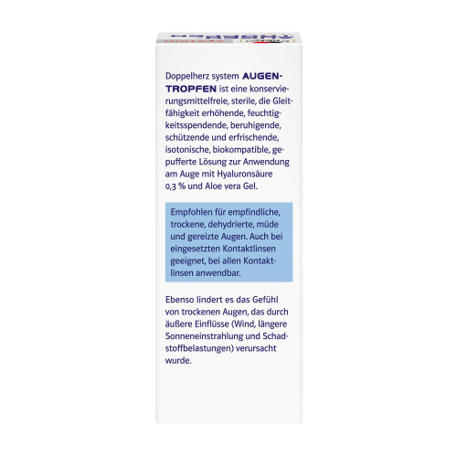 Bei trockenen und gereizten Augen kann man selbst aktiv werden: Doppelherz system AUGEN-TROPFEN mit Hyaluronsäure + Aloe Vera befeuchten und erfrischen die gereizten Augen und sorgen so für ein schnelles Abklingen der Symptome wie müde, gereizte und trockene Augen.