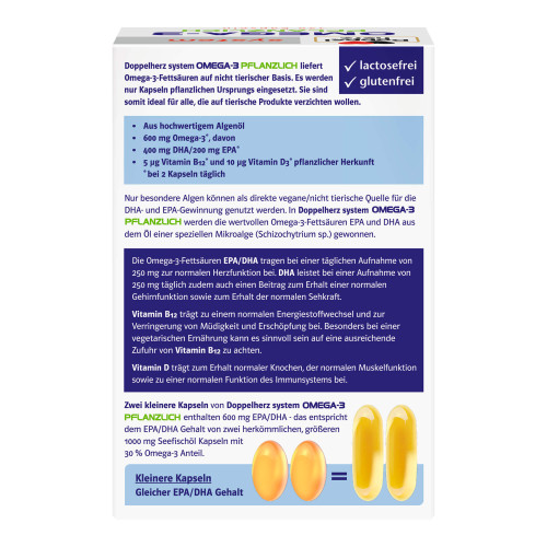 Gesundheitsbewussten Menschen, die Omega-3-Fettsäuren für eine pflanzenbetonte oder rein pflanzliche Ernährung suchen, bietet Doppelherz system ein hochwertiges Nahrungsergänzungsmittel in Kapselform – frei von tierischen Bestandteilen, leicht einzunehmen, ideal für die vegane und vegetarische Lebensweise.