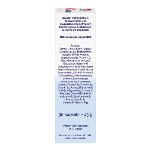 Omega-3-Fettsäuren-haltiges Konzentrat aus Seefischöl, Gelatine (Rind), Kokosöl, Magnesiumoxid, Vitamin C, Feuchthaltemittel Glycerin, Emulgator Mono- und Diglyceride von Speisefettsäuren, Feuchthaltemittel Sorbit, Niacin, Eisenfumarat, Distelöl, Vitamin E, Coenzym Q10, Pantothensäure, Zinkoxid, luteinhaltiges Konzentrat aus Studentenblumen, Vitamin B1, Vitamin B2, Vitamin B6, Farbstoff Eisenoxide und Eisenhydroxide, Vitamin A, Folsäure, Chrom-(III)-chlorid, Kaliumiodid, Natriumselenit, Biotin, Vitamin K, Vitamin D, Vitamin B12.