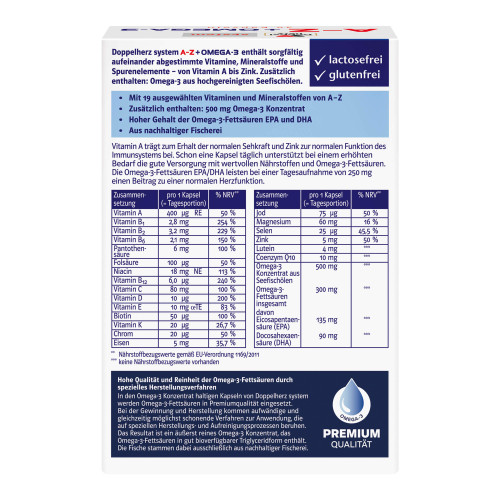 Doppelherz system A-Z + Omega-3 enthält sorgfältig aufeinander abgestimmte Vitamine, Mineralstoffe und Spurenelemente – von Vitamin A bis Zink. Zusätzlich enthalten: Coenzym Q10, Lutein und Omega-3 aus hochgereinigten Seefischölen.