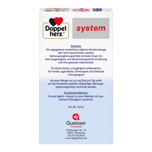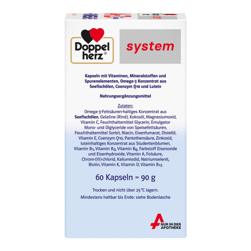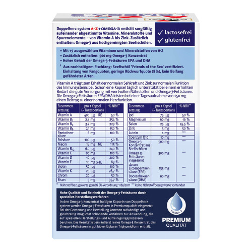 Doppelherz system A-Z + Omega-3 enthält sorgfältig aufeinander abgestimmte Vitamine, Mineralstoffe und Spurenelemente – von Vitamin A bis Zink. Zusätzlich enthalten: Coenzym Q10, Lutein und Omega-3 aus hochgereinigten Seefischölen.