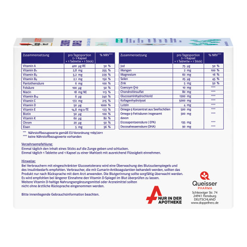 Zutaten der Kapseln: Omega-3-Fettsäuren-haltiges Konzentrat aus Seefischölen, Gelatine (Rind), Kokosöl, Magnesiumoxid, Vitamin C, Feuchthaltemittel Glycerin, Emulgator Mono- und Diglyceride von Speisefettsäuren, Feuchthaltemittel Sorbit, Niacin, Eisenfumarat, Distelöl, Vitamin E, Coenzym Q10, Pantothensäure, Zinkoxid, luteinhaltiges Konzentrat aus Studentenblumen, Vitamin B1, Vitamin B2, Vitamin B6, Farbstoff Eisenoxide und Eisenhydroxide, Vitamin A, Folsäure, Chrom-(III)-chlorid, Kaliumiodid, Natriumselenit, Biotin, Vitamin K, Vitamin D, Vitamin B12.