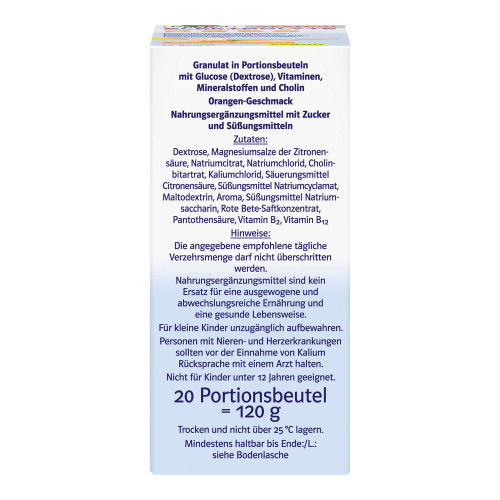 Dextrose, Magnesiumsalze der Zitronensäure, Natriumcitrat, Natriumchlorid, Cholinbitartrat, Kaliumchlorid, Säuerungsmittel Citronensäure, Süßungsmittel Natriumcyclamat, Maltodextrin, Aroma, Süßungsmittel Natriumsaccharin, Rote Bete-Saftkonzentrat, Pantothensäure, Vitamin B2, Vitamin B12.