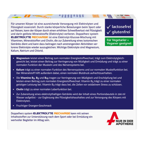 Für unseren Körper ist eine ausreichende Versorgung mit Elektrolyten und Flüssigkeit essenziell. Durch starke körperliche Belastungen beim Sport oder auf Reisen, kann der Körper durch einen erhöhten Schweißverlust viel Flüssigkeit und darin gelöste Mineralstoffe (Elektrolyte) verlieren. Doppelherz system Elektrolyte Recharge ist eine Elektrolyt-Glucose-Mischung mit Vitaminen, Mineralstoffen und Cholin, die zur Zubereitung eines isotonischen Getränks dient und kann dazu beitragen nach anstrengenden Aktivitäten verlorene Elektrolyte wieder auszugleichen. Wichtige Elektrolyte sind Magnesium, Kalium, Natrium und Chlorid.