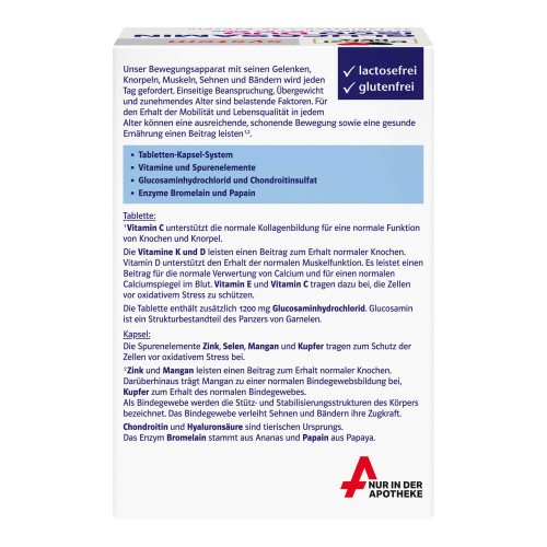Zutaten der Tabletten: Glucosaminhydrochlorid (aus Bestandteilen von Garnelen), Vitamin C, Füllstoff Polyvinylpyrrolidon, Füllstoff Cellulosepulver, Überzugsmittel Hydroxypropylmethylcellulose, Trennmittel Siliciumdioxid, Trennmittel Magnesiumsalze der Speisefettsäuren, Füllstoff vernetzte Carboxymethylcellulose, Trennmittel Magnesiumhydroxidcarbonat, Farbstoff Calciumcarbonat, Trennmittel Talkum, Füllstoff Hydroxypropylcellulose, Überzugsmittel Polyethylenglycol, Füllstoff mikrokristalline Cellulose, Vitamin E, Vitamin K, Vitamin D.