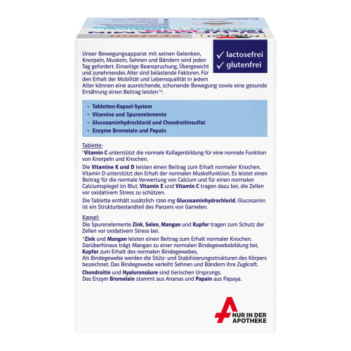 Zutaten der Tabletten: Glucosaminhydrochlorid (aus Bestandteilen von Garnelen), Vitamin C, Füllstoff Polyvinylpyrrolidon, Füllstoff Cellulosepulver, Überzugsmittel Hydroxypropylmethylcellulose, Trennmittel Siliciumdioxid, Trennmittel Magnesiumsalze der Speisefettsäuren, Füllstoff vernetzte Carboxymethylcellulose, Trennmittel Magnesiumhydroxidcarbonat, Farbstoff Calciumcarbonat, Trennmittel Talkum, Füllstoff Hydroxypropylcellulose, Überzugsmittel Polyethylenglycol, Füllstoff mikrokristalline Cellulose, Vitamin E, Vitamin K, Vitamin D.