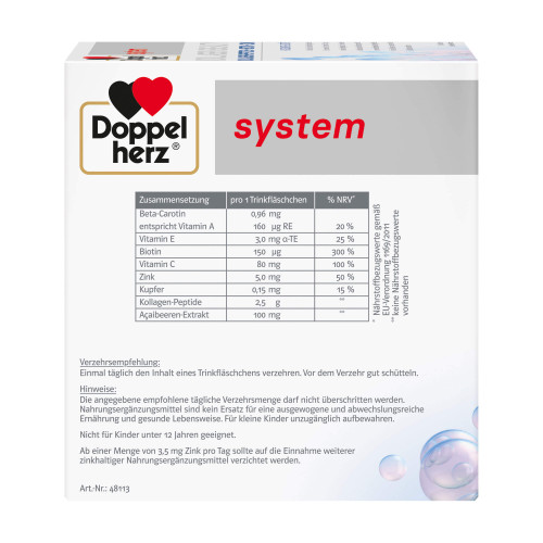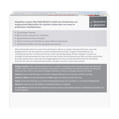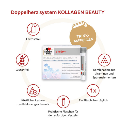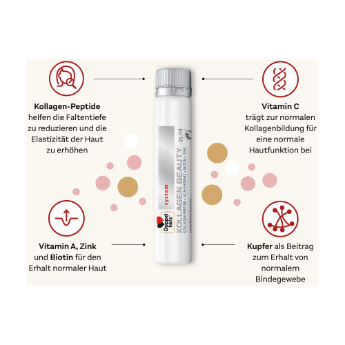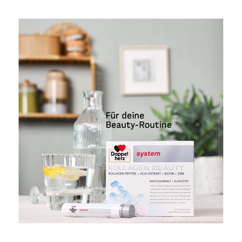 Doppelherz system Kollagen Beauty enthält eine Kombination aus ausgesuchten Nährstoffen für natürlich schöne Haut von innen.