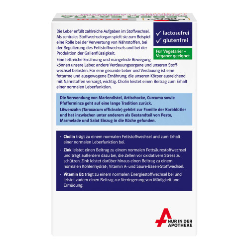 Mariendistelfrüchteextrakt, Cholinbitartrat, Hydroxypropylmethylcellulose, Maltodextrin, Artischockenblätterextrakt, Löwenzahnwurzelextrakt, Curcumawurzelextrakt, Zinkgluconat, Pfefferminzblätterextrakt, Trennmittel Magnesiumsalze der Speisefettsäuren, Farbstoff Eisenoxide- und Eisenhydroxide, Vitamin B2.