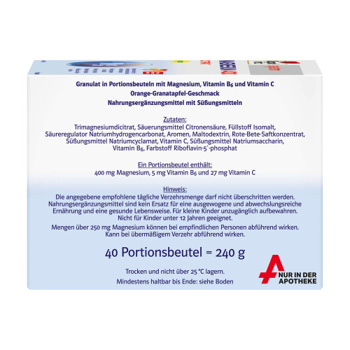 Trimagnesiumdicitrat, Säuerungsmittel Citronensäure, Füllstoff Isomalt, Säureregulator Natriumhydrogencarbonat, Aromen, Maltodextrin, Rote-Bete-Saftkonzentrat, Süßungsmittel Natriumcyclamat, Vitamin C, Süßungsmittel Natriumsaccharin, Vitamin B6, Farbstoff Riboflavin-5-phosphat.