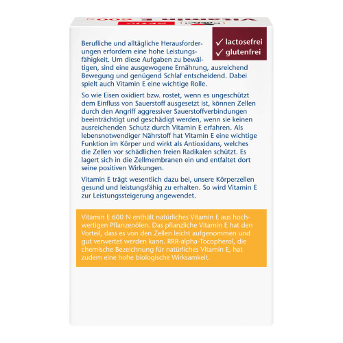 Vitamin E 600 N, Weichkapseln. Wirkstoff: RRR-alpha-Tocopherol. Anwendungsgebiete: Für Erwachsene. Zur Leistungssteigerung. Warnhinweise: Enthält Sojaöl und Sorbitol.
