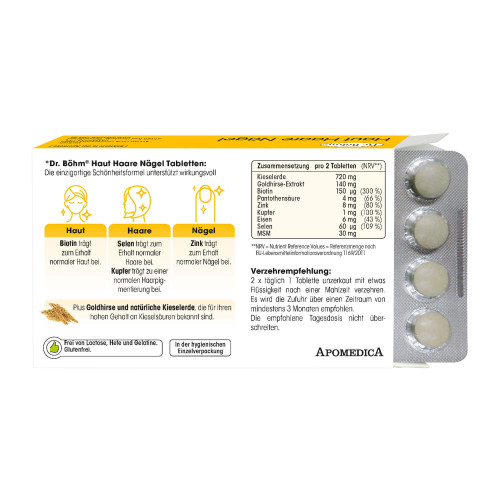 Dr. Böhm® Haut Haare Nägel Tabletten enthalten bewährte Vitamine, Mineralien und Spurenelemente. Sie tragen zum Erhalt normaler Haut und Haare (Biotin und Zink) sowie normaler, fester Nägel (Zink und Selen) bei. Die Tabletten enthalten außerdem natürliche Kieselerde und Goldhirse, die für ihren Gehalt an Kieselsäuren bekannt sind.