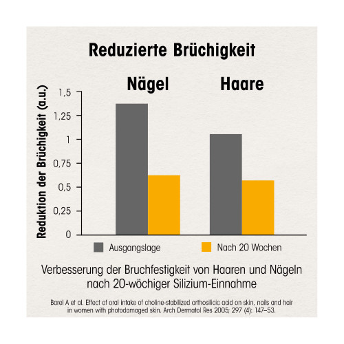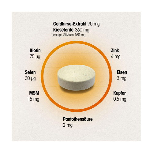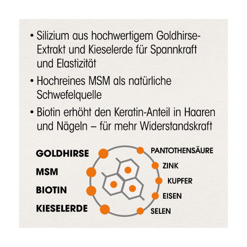 Nahrungsergänzungsmittel Biotin, Zink, Selen, MSM, Goldhirse-Extrakt und Kieselerde.