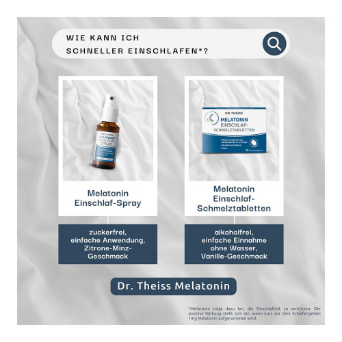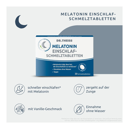 Die Dr. Theiss Melatonin Einschlaf-Schmelztabletten zergehen auf der Zunge. Melatonin trägt dazu bei, die Einschlafzeit zu verkürzen**.