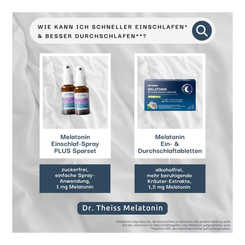 Das Dr. Theiss Melatonin Einschlaf-Spray PLUS kann helfen: es kombiniert Melatonin mit Passionsblumen-, Hopfen- und Baldrianextrakt.