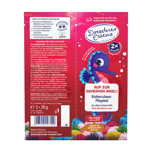 Komm und entdecke die Blubberbande: Stella das Seepferdchen verwandelt dein Badewasser in ein zartes Rosa mit süßem Erdbeer-Duft und sorgt so für besonderen Badespaß. Die Rezeptur mit pflegendem Mandelöl ist speziell auf zarte Kinderhaut abgestimmt. Hautverträglichkeit dermatologisch bestätigt. Für Kinder ab 1 Jahr.