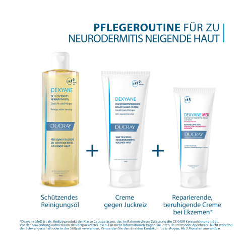 Dexyane Schützendes Reinigungsöl reinigt, pflegt und schützt Gesicht und Körper von sehr trockener, zu Neurodermitis neigender Haut.