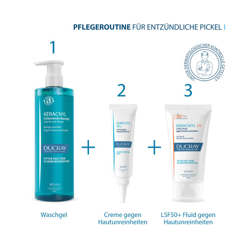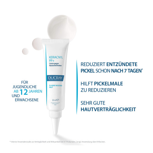 Die KERACNYL PP+ Creme gegen Hautunreinheiten reduziert entzündete Pickel und hilft, Pickelmale vorzubeugen.