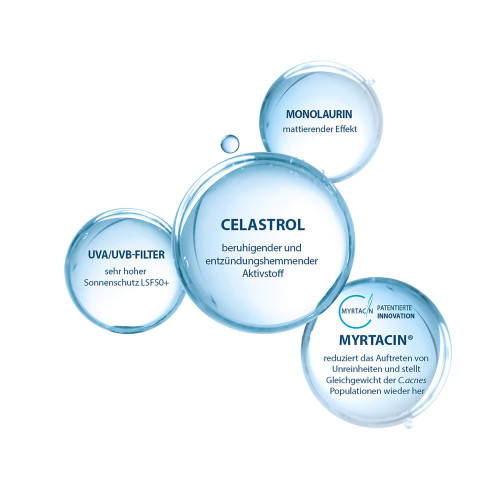 Die einzigartige Kombination aus einem UVA-/UVB-Breitbandfilter sowie den Aktivstoffen Myrtacin® und Celastrol® bietet eine 2-in-1 Pflege bei fettiger, zu Akne neigender Haut: eine unterstützende, nicht komedogene Pflege gegen Unreinheiten vereint mit einem sehr hohen Sonnenschutz LSF 50+.