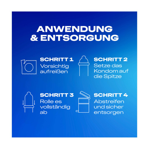 Bitte beachte die Informationen auf der Innenseite der Packung, insbesondere, wenn du Kondome für Anal- oder Oralsex benutzt. Denken Sie daran, dass keine Verhütungsmethode zu 100 % vor Schwangerschaft, HIV oder sexuell übertragbaren Krankheiten schützt. Kondome können eine Erstickungsgefahr darstellen. Außerhalb der Reichweite von Kindern aufbewahren. Überprüfe vor der Verwendung das Verfallsdatum auf der Verpackung. Ist die Kondomfolie offensichtlich beschädigt, wirf das Kondom weg und benutze ein neues aus einer unbeschädigten Verpackung. Benutze jedes Kondom nur einmal. Eine Wiederverwendung erhöht das Risiko einer Beschädigung oder Infektion.