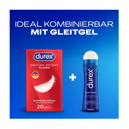 Bitte die Anwendungshinweise auf der Packung vor der Verwendung sorgfältig durchlesen. Damit du das Kondom gleich richtig herum aus der Folie nimmst und überziehen kannst, halte die Folie beim Öffnen mit dem Durex Logo nach unten. Benutze nur Gleitmittel, die für die Verwendung mit Kondomen empfohlen werden – das Gel wird einfach außen auf das bereits angelegte Kondom aufgetragen.