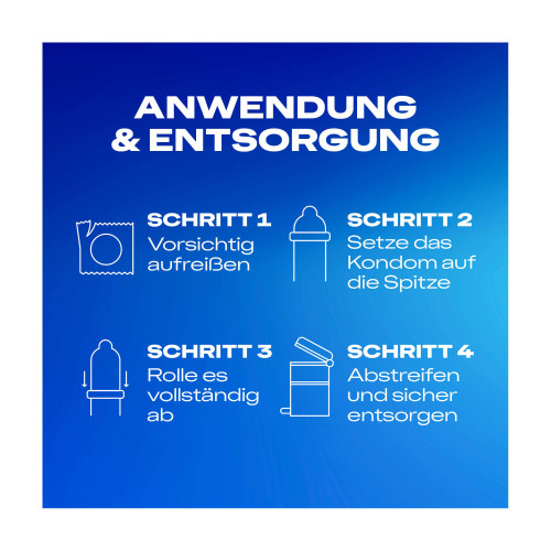Denke daran, dass keine Verhütungsmethode zu 100 % vor Schwangerschaft, HIV oder sexuell übertragbaren Krankheiten schützt. Es ist gut, Bescheid zu wissen – deshalb beachte bitte die Informationen auf der Innenseite der Packung, insbesondere, wenn du Kondome für Anal- oder Oralsex benutzt.